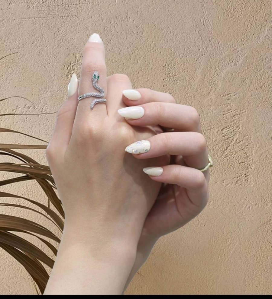 خاتم فضة 975 على شكل أفعى مرصوص بالزركون الاخضر والأبيض.