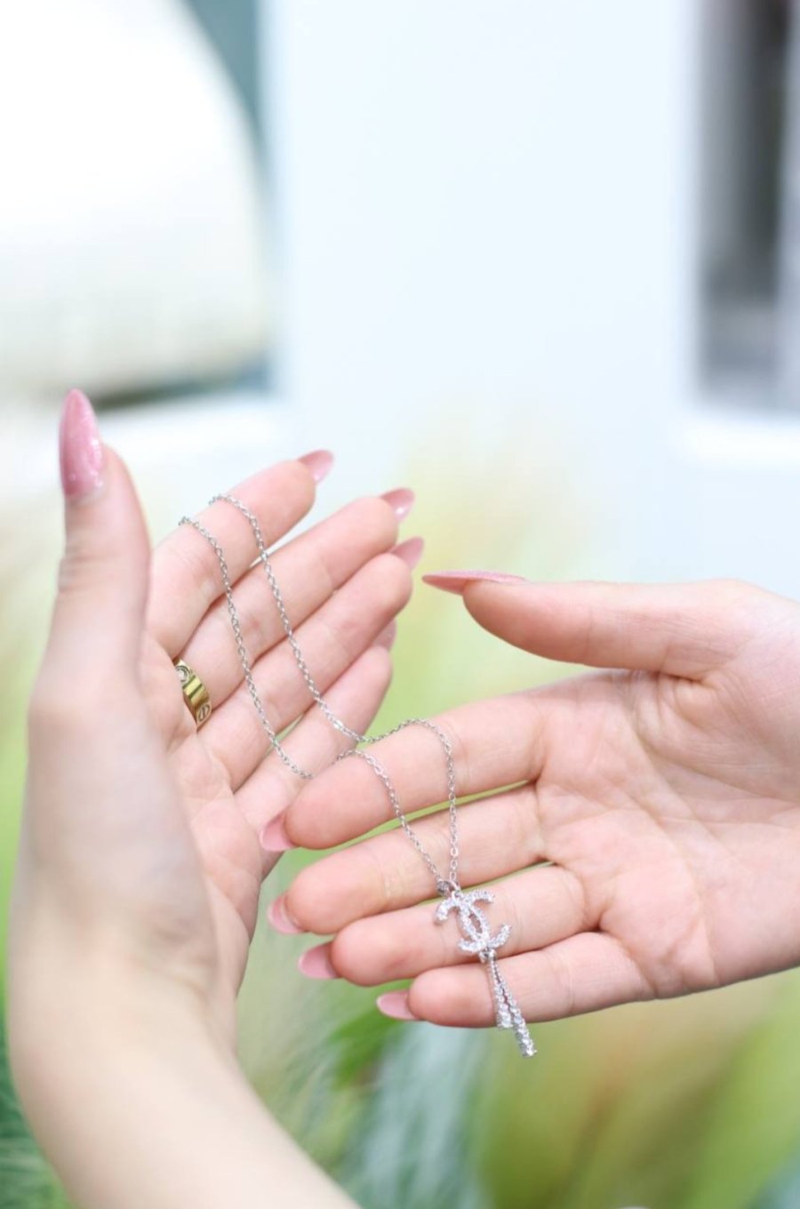 سلسال فضة، مرصوص بالزركون على شكل علامة شانيل.