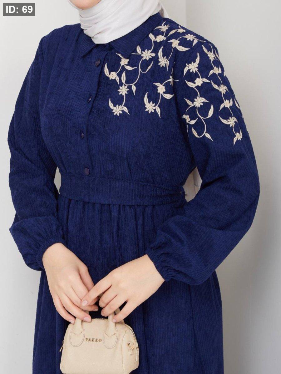 فستان مميز بتطريز وردة على الكتف ناعم وأنيق ،أزرار على الصدر قابلة للفتح.