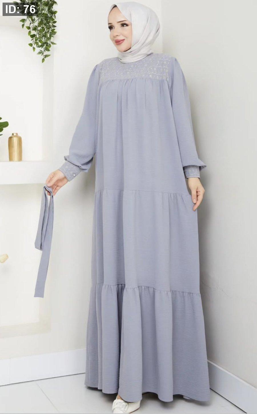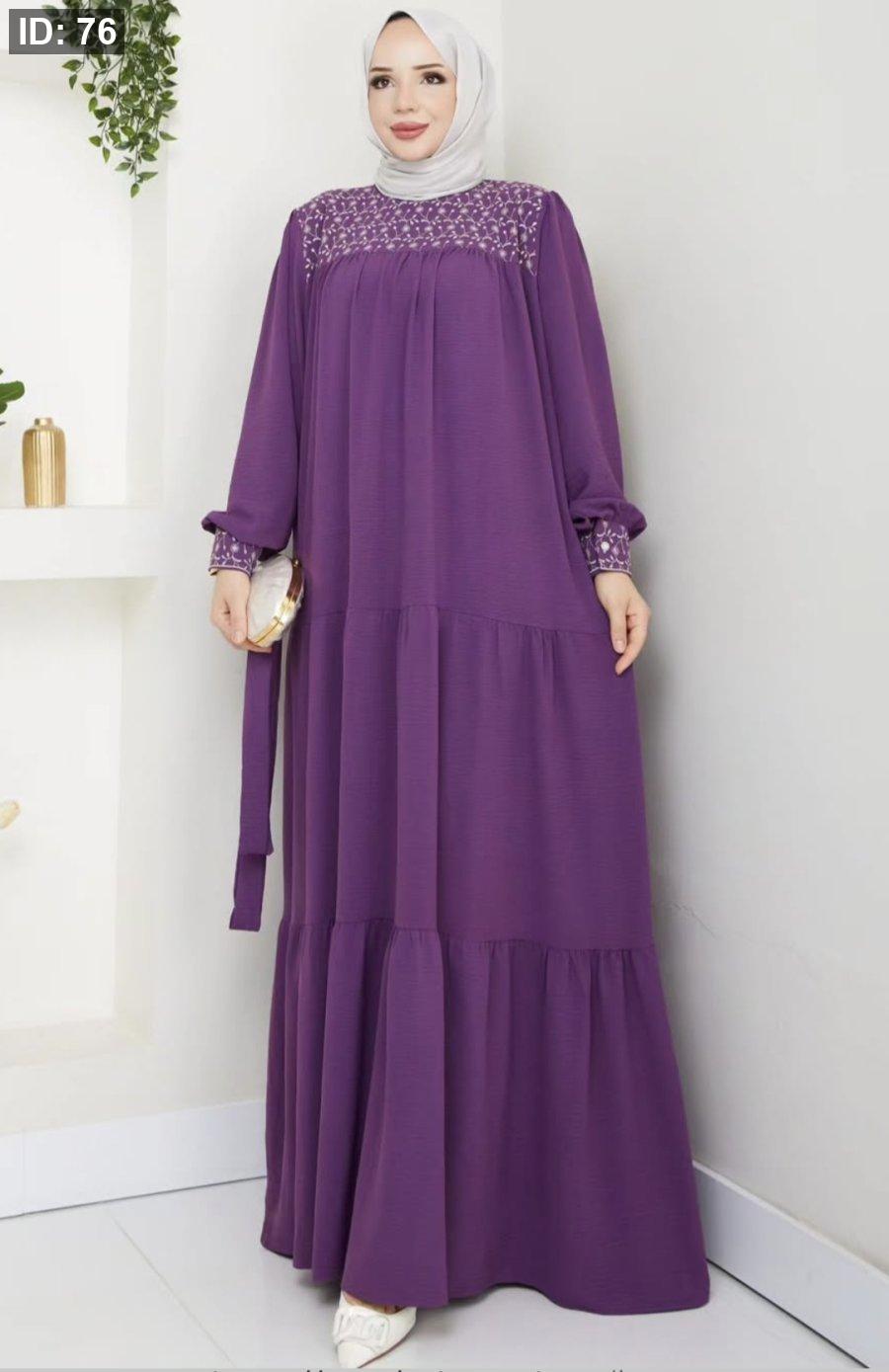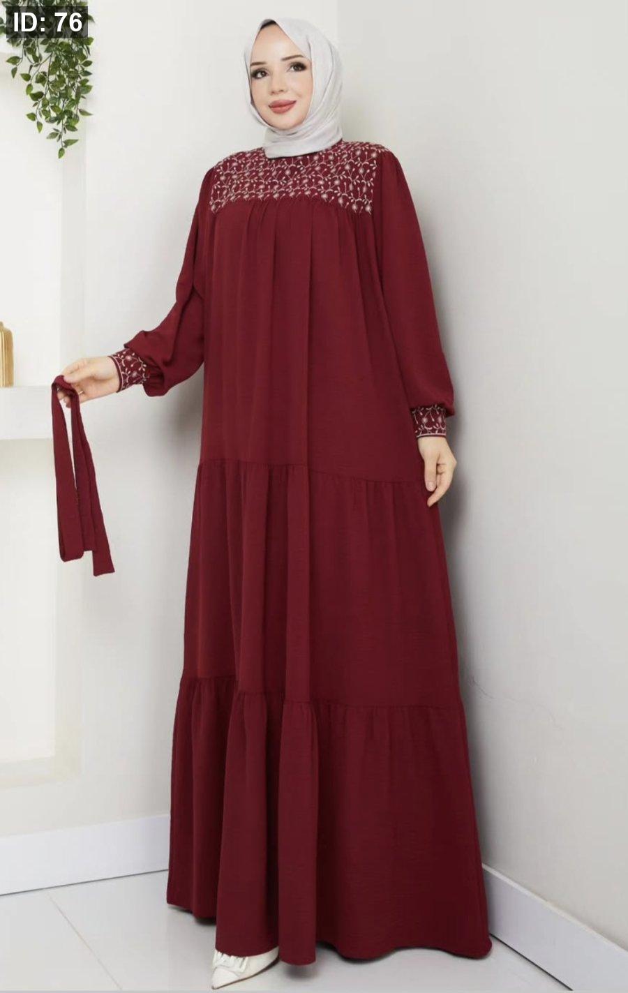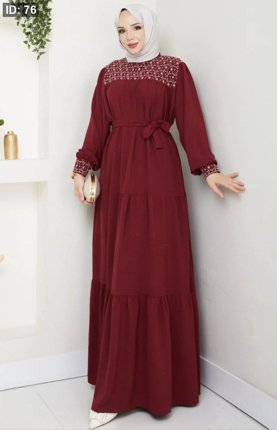 تصميم أنيق وفضفاض باضافة تطريز على الصدر والكف، فستان سحبة واحدة