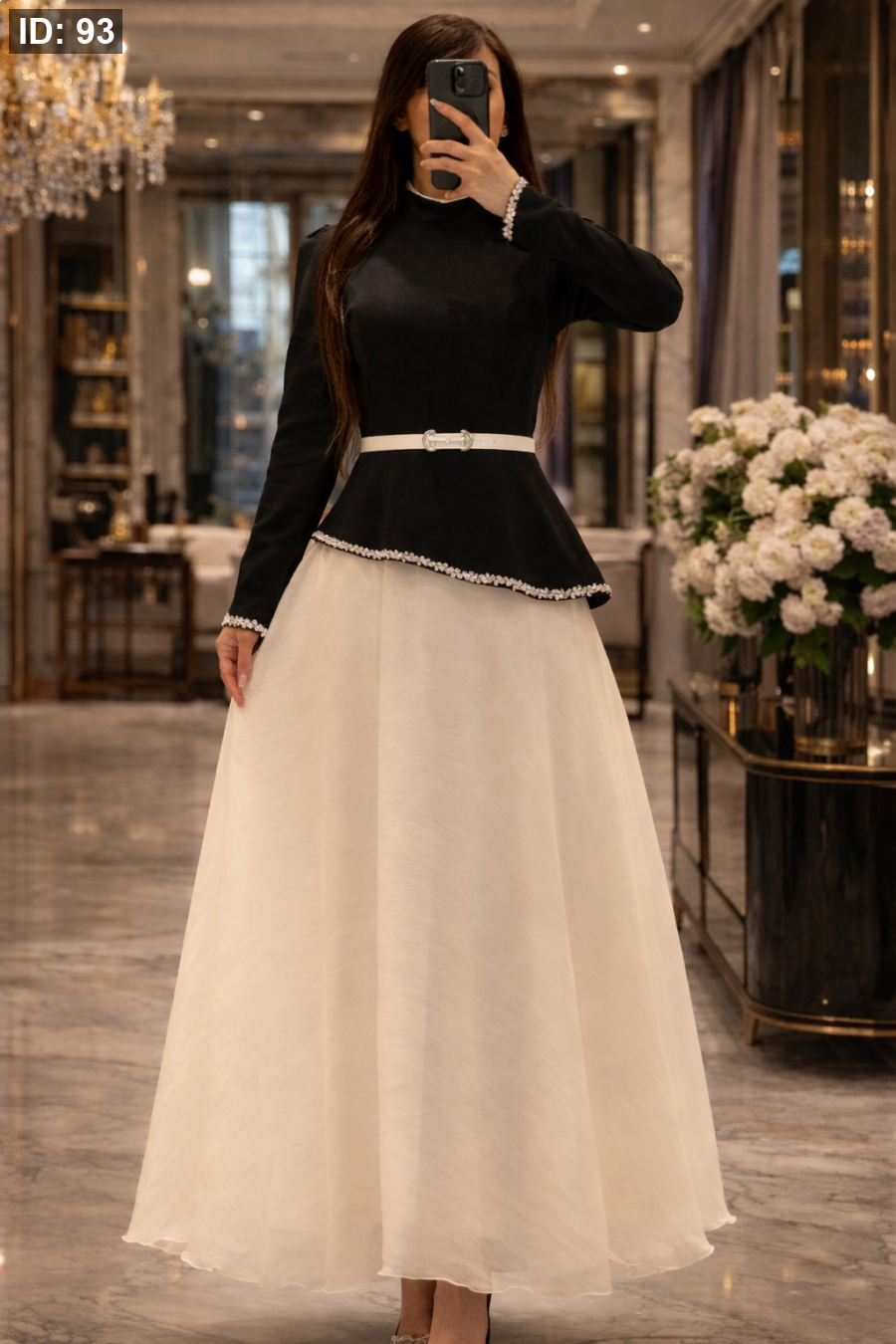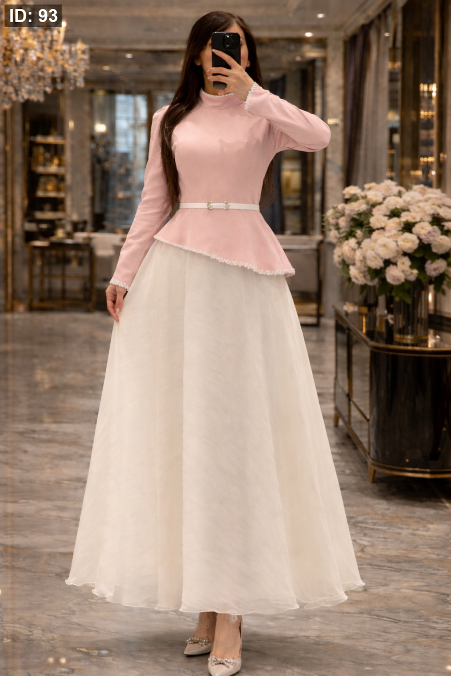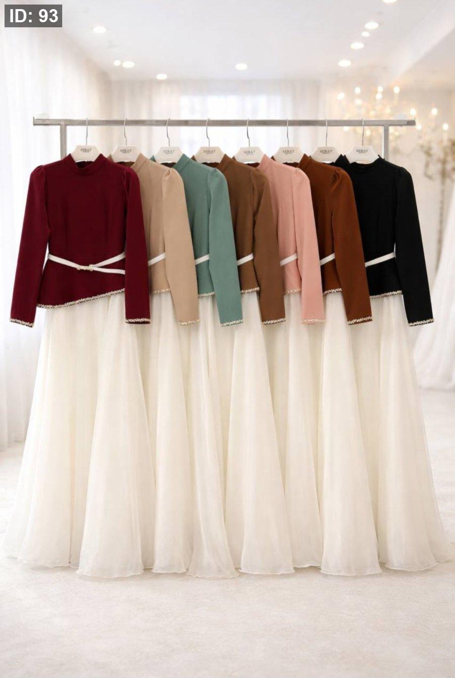 إضافة الكريستال على الكمام والعنق والخصر مع تصميم انيق، وتناسق الوان انسيابي.